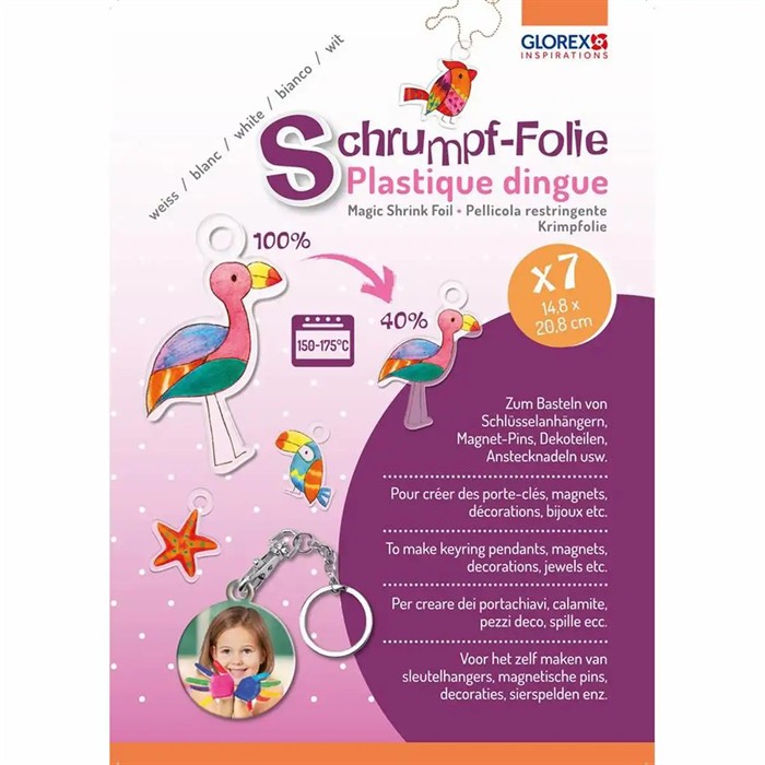 Mit der Schrumpf-Folie von Glorex lassen sich ganz einfach kreative Anhänger und kleine Dekorationen selbst herstellen. Die Folie wird zuerst bemalt oder beschriftet und anschliessend im Backofen erhitzt. Dabei schrumpft sie auf etwa 40 % ihrer ursprünglichen Grösse und wird gleichzeitig stabil und fest perfekt für kleine Bastelprojekte.