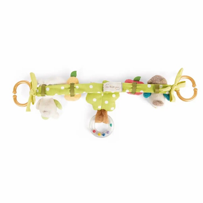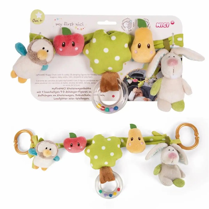 ie My First NICI Kinderwagenkette ist einfach ein Must-Have für jeden Babyhaushalt. Mit zwei abnehmbaren Fixierungsringen ausgestattet, lässt sich die Kette am Kinderwagen, Babyschale, Bettchen, Wiege oder Spielbogen befestigen und ist eine zauberhafte Beschäftigung fürs Baby. Die My First NICI Kinderwagenkette kommt mit fünf kuscheligen 3-D Anhänger-Figuren und hat eine Länge von 45cm. Die Eule mit Rassel, der quietschende Hase und der Baum mit Greifring laden zum Beobachten, Fühlen und Greifen ein und fordern die Neugier der Kleinen heraus, die Welt mit allen Sinnen zu entdecken.