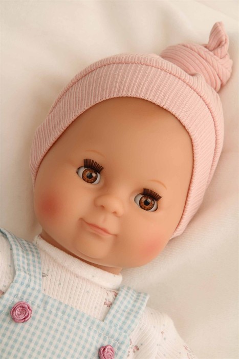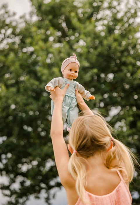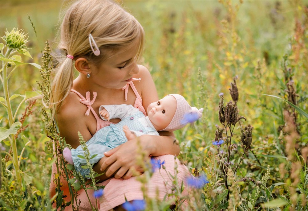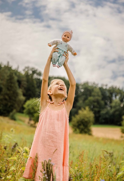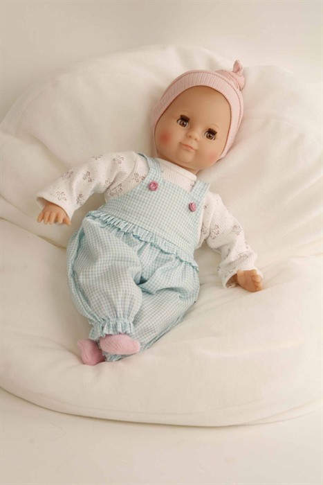 Mein erstes Schlummerle, die beliebteste und bekannteste Puppe, ohne Haare für die Kleinsten. Ein unverwechselbares Gesicht vereint Qualität und Spielwert und begeistert schon seit Generationen unsere Puppenmuttis.Die Puppe wird in unserer eigenen Puppenmanufaktur in Rauenstein/Thüringen hergestellt. Arme, Beine und Kopf sind aus Vinyl, sie hat lustige blaue Schlafaugen und gemalte Haare. Das Schlummerle trägt eine türkis karierte Latzhose, einen weissen Pulli mit Blumen bedruckt und eine rose Strickmütze. Die Kleidung ist von Hand bei 30 Grad waschbar.