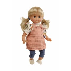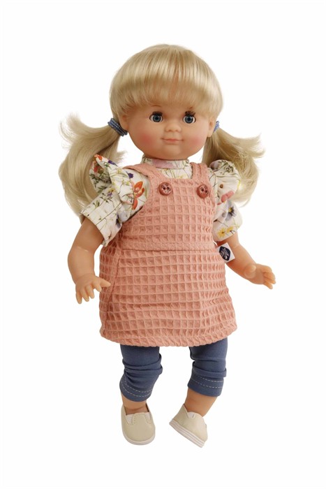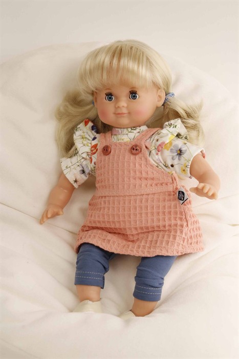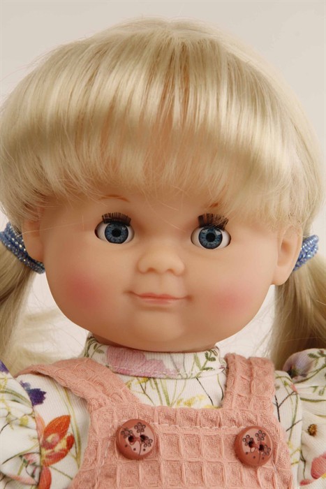 Die Puppe wird in unserer eigenen Puppenmanufaktur in Rauenstein/Thüringen hergestellt. Arme, Beine und Kopf sind aus Vinyl, sie hat lustige blaue Schlafaugen, sowie strapazierfähige, kämmbare, eingesteppte blonde Haare. Es trägt eine Kleidung in apricot/blau mit Blumendruck. Diese ist leicht an- und ausziehbar und bei 30 Grad per Hand waschbar.