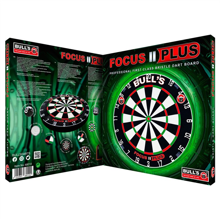 Das Focus II Plus ist der Beginn einer neuen Dartboard Ära. Dieses Board ist das beste BULL'S Dartboard aller Zeiten. Seit über 30 Jahren steht BULL'S für Innovation und Qualität und findet hiermit seinen vorläufigen Höhepunkt. Akribisch wurden alle Komponenten des Focus II Plus geplant, entworfen und miteinander zu diesem einzigartigen Dartboard verschmolzen. High End Dartboard-Technologie in einem umwerfenden Design. Das Herzstück ist das herausragende afrikanische Sisal. Langlebig und höchsten Ansprüchen gewachsen. Die neuartiger Sisalverarbeitung kreiert ein erstaunlich kontrastreiches und hochwertiges Trefferfeld. Diese neue Sisalverarbeitung erleichtert ebenfalls das Eindringen der Darts in das Board und stabilisiert den Dart im Board. Dieses Verfahren ermöglicht ein sehr tiefes einlassen des Spiders im Sisal, Bouncer (Abpraller) werden damit nahezu ausgeschlossen. Durch das tief eingelassene, extra dünne Spider wird die Trefferfläche optimiert, dieses wird vor allem im Bereich des BULL'S Eyes im Vergleich zu herkömmlichen Dartboards deutlich. Das angewandte Spider-Leg-Free-Verfahren ermöglicht es, dass keine Metallhalterungen rund um das Trefferfeld zu sehen sind. Der Gesamteindruck des Dartboards wird dadurch erheblich gesteigert. Der scharfe High-Quality-Aufdruck sowie die modernen Metallnummern vollenden den herausragenden Gesamteindruck des Focus II Plus. Die Metallnummern befinden sich an einem drehbaren und pulverbeschichteten Nummernring, Reflexionen werden dadurch vermieden. Das Focus II Plus besitzt exakte Turniermasse (45,5 x 3,8 cm) und entspricht damit internationalen Turnierregularien. Eine Nutzungsanleitung und eine Boardwandhalterung werden mitgeliefert.