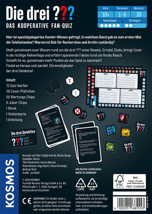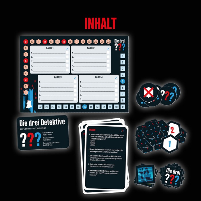 „Die drei ???-Fans aufgepasst, hier ist spezialgelagertes Wissen gefragt! Welches Cover gehört zu diesem Fall? Wie heißt der größte Widersacher der Detektive? Über 350 spannende Fragen warten in diesem kooperativen Quizspiel, das Fans ab zehn Jahren mit kniffligen Fragen fordert. Für die ein bis sechs Spielerinnen und Spieler bietet es abwechslungsreichen Spielspaß. Egal, ob Fragen zu Büchern, Hörspielen oder Covern hier kann man sein Wissen unter Beweis stellen. Joker unterstützen bei schwierigen Antworten, während Bonus-Fragen besonderes Wissen belohnen. So entsteht ein Quiz, das das Wissen über die drei Detektive auf die Probe stellt und für spannende Momente sorgt. Hier können auch Fans der Reihe immer wieder Neues entdecken!