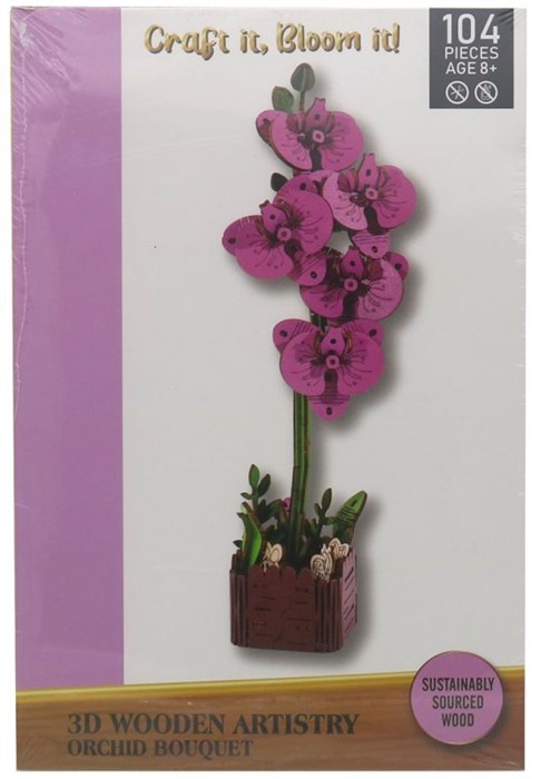 Mit diesem 3D Holzbausatz entsteht ein stilvolles Orchideen-Bouquet, das dauerhaft in kräftigem Pink erstrahlt. Aus 104 präzise gefertigten Holzteilen baust du dir Schritt für Schritt ein detailreiches Blumenarrangement, das sofort ins Auge fällt.