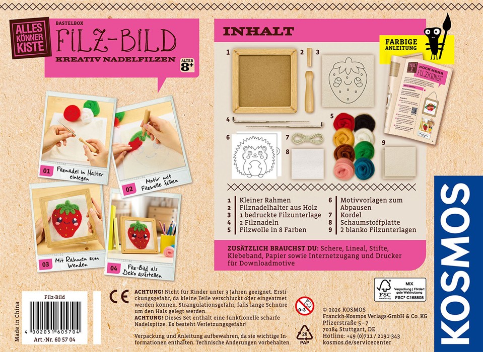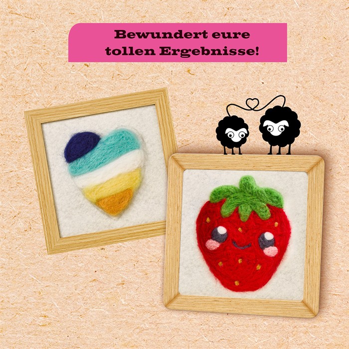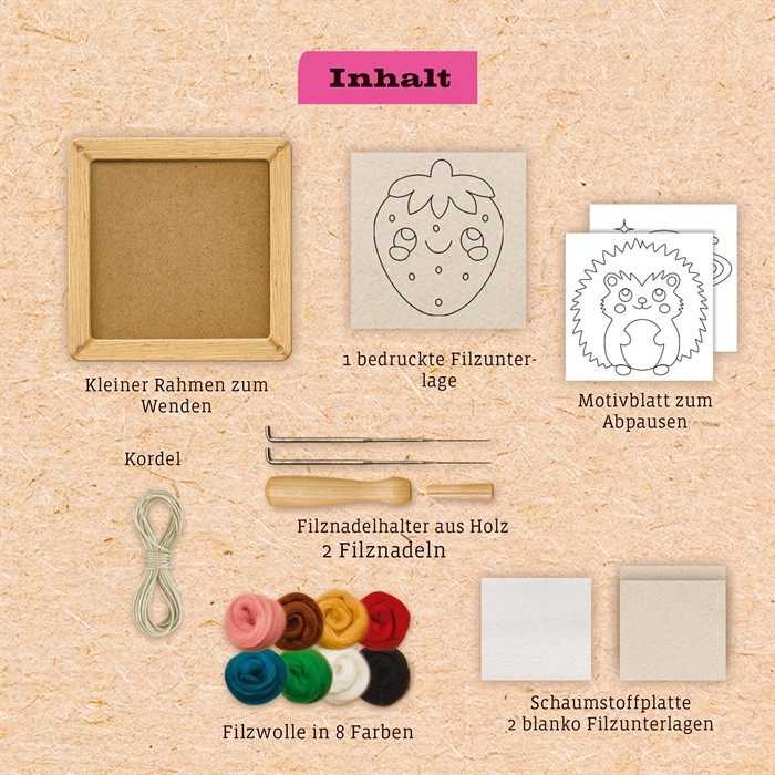 Stück für Stück zum Traumbild! Mit bunter Filzwolle entsteht ein lebendiges Deko-Bild. Acht Farben und einfache Vorlagen nach dem „Malen-nach-Zahlen-Prinzip sorgen dafür, dass das Filzen leicht gelingt und kleine wie grosse Künstlerinnen und Künstler schnell Freude am Ergebnis haben. Die AllesKönnerKiste enthält alles, was für den Einstieg in das Nadelfilzen gebraucht wird: Eine niedliche Motiv-Vorlage sowiesowie zwei Motive zum Abpausen und weitere zum Download, bunte Filzwolle in acht Farben, kreative Ideen für eigene Filzbilder, eine bebilderte Schritt-für-Schritt-Anleitung und einen stabilen Holzhalter für die Filz-Nadeln, der das Arbeiten sicher und angenehm macht. Wer möchte, kann das fertige Bild direkt im enthaltenen kleinen Rahmen ausstellen und das eigene Zimmer damit verschönern. Eine DIY-Bastelbox für Kinder ab acht Jahren.