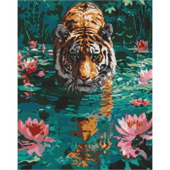 Die intensive Kombination aus tiefem Türkis, sattem Grün und warmem Orange sorgt für eine starke Bildwirkung. Beim Setzen der Steinchen entwickelt sich Schritt für Schritt ein lebendiges Kunstwerk mit beeindruckender Tiefe. Besonders die Spiegelung im Wasser und der durchdringende Blick des Tigers verleihen dem Motiv eine aussergewöhnliche Dynamik.