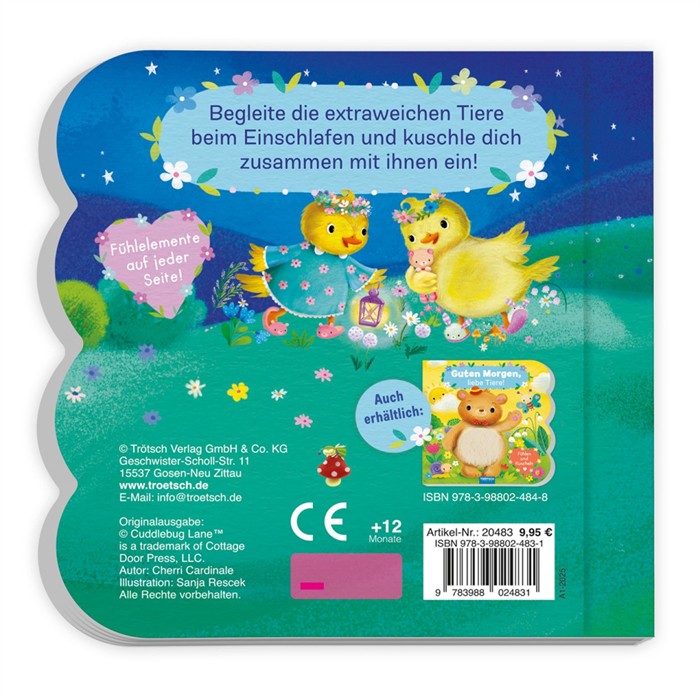 Die niedlichen Tiere sagen gute Nacht! Mit dem liebevoll illustrierten Fühlbuch kommen schon die Kleinsten mit stimmigen Reimen nach einem aufregenden Tag zur Ruhe. Die Fühlelemente auf jeder Seite laden zum Anfassen, Entdecken und Staunen ein. Der optimale Begleiter zum gemeinsamen Vorlesen und Kuscheln!