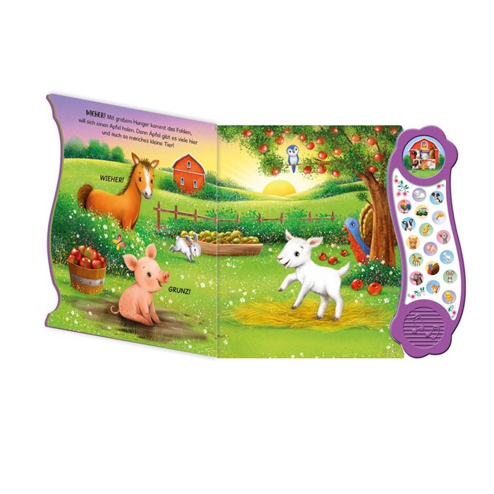Mit der integrierten Soundleiste lassen sich insgesamt 18 verschiedene Tier- und Bauernhofgeräusche abspielen. So können Kinder spielerisch lernen, wie Kuh, Pferd, Huhn, Ente und viele weitere Tiere klingen. Die grossen, farbenfrohen Illustrationen laden zum Entdecken und Erzählen ein und machen das Buch zu einem besonderen Erlebnis.
