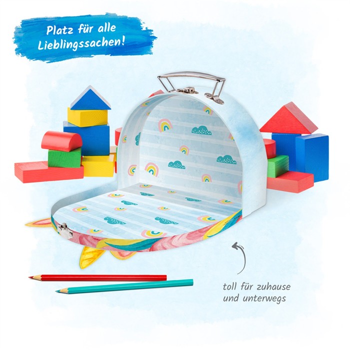 Der stabile Koffer bietet genügend Platz für Spielzeug, Bastelsachen oder kleine Schätze. Dank der extra stabilen Verarbeitung, des praktischen Metallgriffs und des sicheren Verschlusses lässt er sich leicht tragen und sicher verschliessen.