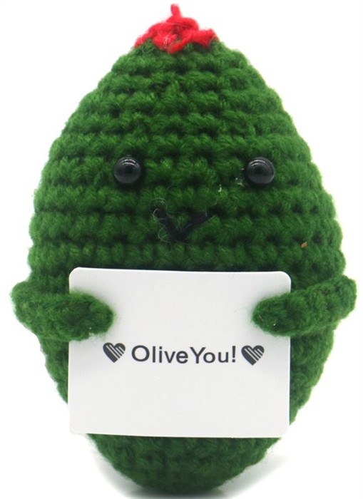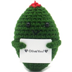 Diese niedliche, gehäkelte Olive bringt eine liebevolle Botschaft mit einem Augenzwinkern. Mit ihrem freundlichen Gesicht und dem charmanten Wortspiel sorgt sie garantiert für ein Lächeln.