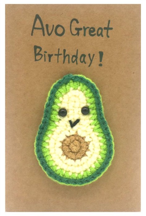 Diese niedliche, gehäkelte Avocado bringt garantiert gute Laune zum Geburtstag. Mit ihrem süssen Gesicht und der humorvollen Botschaft ist sie eine originelle kleine Aufmerksamkeit, die jedem Geburtstagskind ein Lächeln ins Gesicht zaubert.
