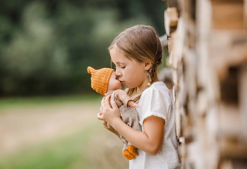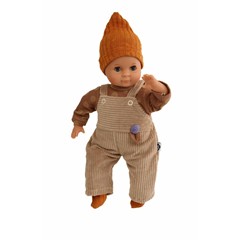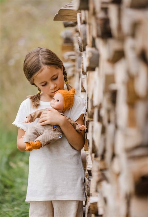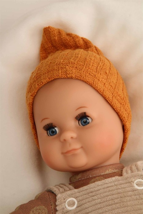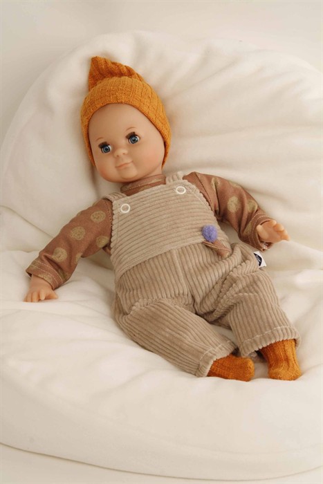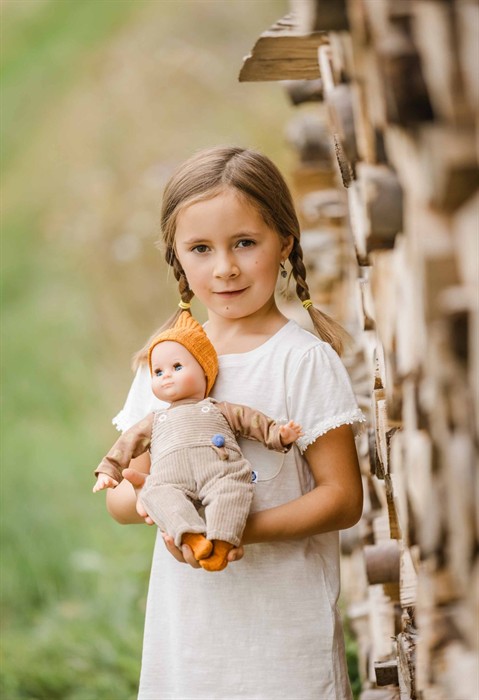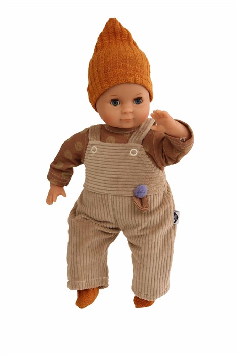 Mein erstes Schlummerle, die beliebteste und bekannteste Puppe, ohne Haare für die Kleinsten. Ein unverwechselbares Gesicht vereint Qualität und Spielwert und begeistert schon seit Generationen unsere Puppenmuttis.Die Puppe wird in unserer eigenen Puppenmanufaktur in Rauenstein/Thüringen hergestellt. Arme, Beine und Kopf sind aus Vinyl, sie hat lustige blaue Schlafaugen und gemalte Haare. Es trägt eine hellbraune Cordhose, ein braunes Shirt mit gelben Tupfen, orange Söckchen und Mütze. Die Kleidung ist leicht an- und ausziehbar und bei 30 Grad per Hand waschbar.