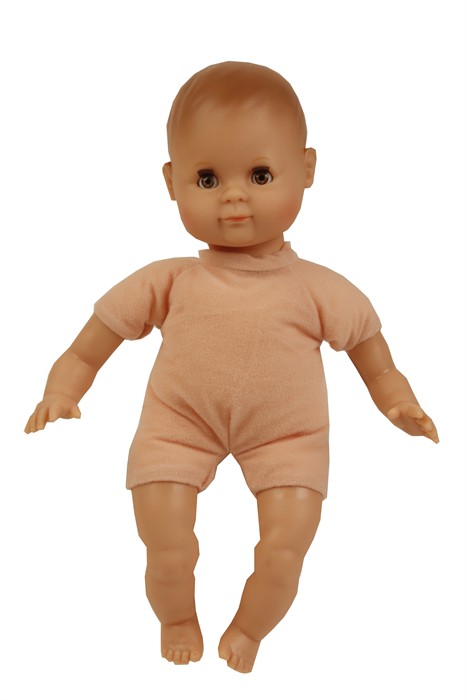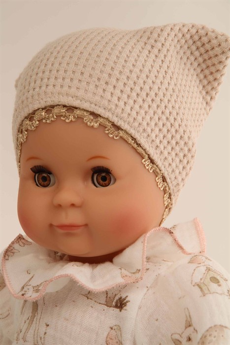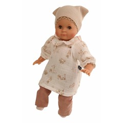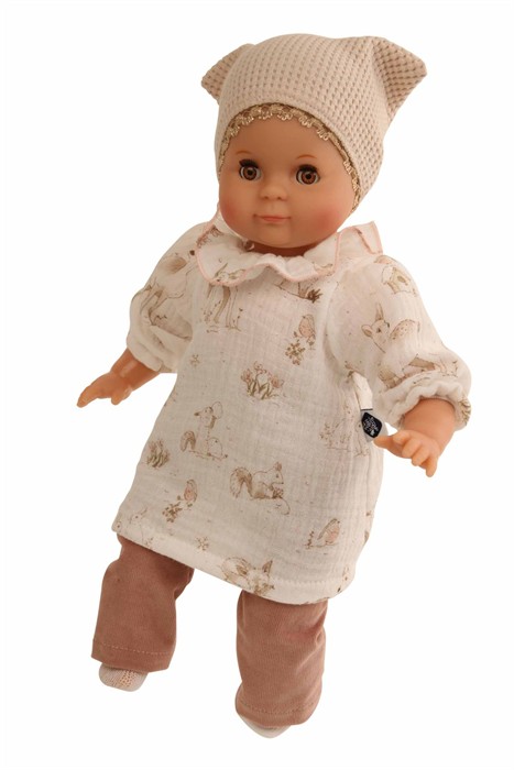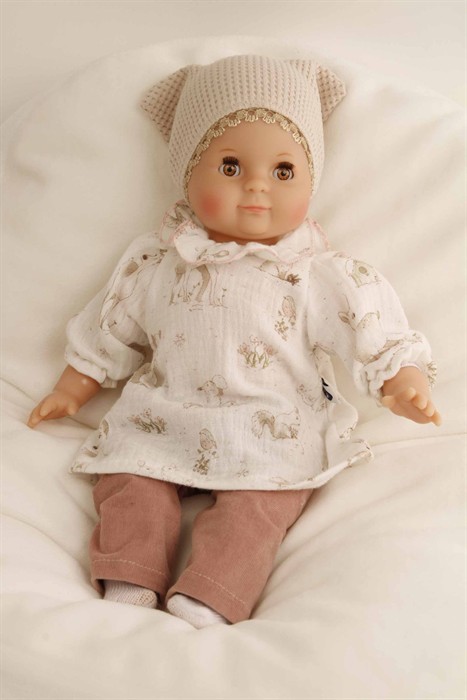 Mein erstes Schlummerle, die beliebteste und bekannteste Puppe, ohne Haare für die Kleinsten. Ein unverwechselbares Gesicht vereint Qualität und Spielwert und begeistert schon seit Generationen unsere Puppenmuttis.Die Puppe wird in unserer eigenen Puppenmanufaktur in Rauenstein/Thüringen hergestellt. Arme, Beine und Kopf sind aus Vinyl, sie hat lustige braune Schlafaugen und gemalte Haare. Das Schlummerle trägt eine rosenholzfarbige Feincordhose, eine beige Tunika mit Waldtieren bedruckt und eine beige Mütze aus Waffelpique. Die Kleidung ist von Hand bei 30 Grad waschbar.
