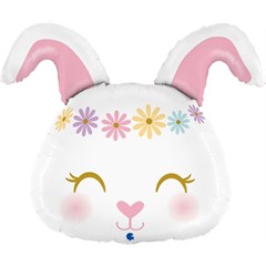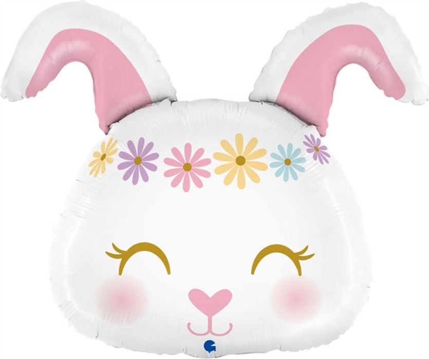 Dieser liebevoll gestaltete Folienballon in Form eines Hasenkopfes sorgt sofort für fröhliche Stimmung. Mit seinen geschlossenen Augen, den rosigen Bäckchen und dem bunten Blumenkranz im Hippie-Stil ist er ein echter Hingucker für Ostern, Kindergeburtstage oder Frühlingsfeste.