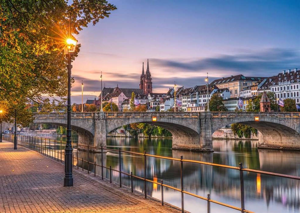 Ein stimmungsvolles Basel bei Sonnenaufgang: Die historische Brücke, die Altstadt und die warmen Lichtreflexionen im Rhein machen dieses Puzzle zu einem echten Blickfang. Stück für Stück entsteht eine detailreiche Schweizer Stadtansicht mit besonderer Atmosphäre.