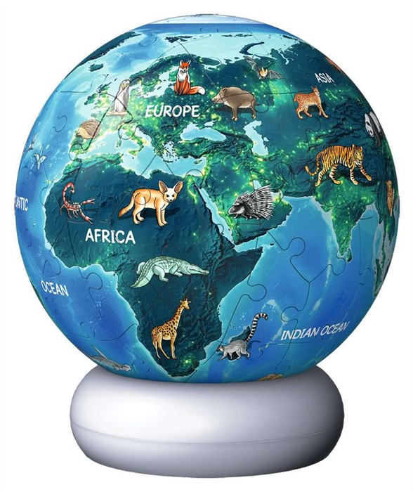 Für heldenhafte Träume 3D Puzzle-Ball als dekoratives Nachtlicht im coolen DesignDieser dekorative Tierglobus wird zum stimmungsvollen Nachtlicht, sobald der 2-stufig dimmbare Leuchtsockel den 3D Puzzle-Ball von innen erstrahlen lässt. Die perfekte Einschlafhilfe für alle Weltentdecker! Dabei ist die coole kleine Lampe so kinderleicht zu bedienen wie eine Touch Lampe. Sie funktioniert kabellos mit Batterien oder über den integrierten USB-C-Anschluss. Das besondere Geschenk für alle puzzlebegeisterten Mädchen und Jungen ab 6 Jahren.Der Bausatz besteht aus 72 dreidimensional geformten, nummerierten Kunststoff-Puzzleteilen, die dank Easyclick Technology passgenau zusammenhalten ganz ohne Kleben! Eine bebilderte Schritt-für-Schritt-Anleitung sorgt für dreidimensionalen Puzzlespaß mit Gelinggarantie! Zusammen mit dem ebenfalls im Set enthaltenen LED-Leuchtsockel im modernen Design entsteht ein fantasievolles und ganz besonderes Nachtlicht, das von Kindern spielend leicht bedient werden kann. Durch Herunterdrücken des Balls entsteht im Kinderzimmer eine angenehme, dezente Lichtquelle, die Kinder mit ihren Lieblingshelden sanft in den Schlaf begleitet und bei Dunkelheit farbenfrohe Orientierung bietet.