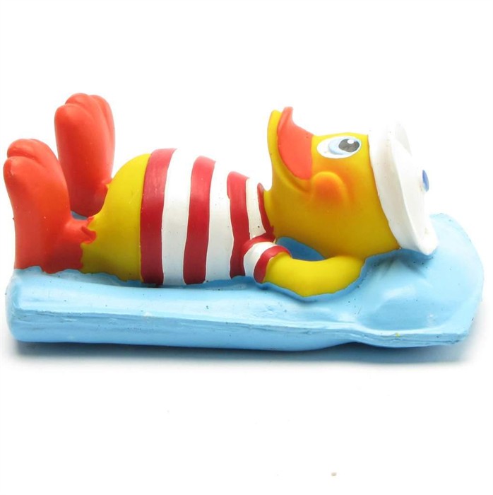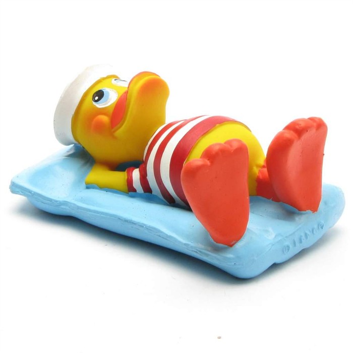 Diese Badeente bringt sofort Ferienfeeling in die Badewanne. Entspannt auf ihrer Luftmatratze liegend und im rot-weiss gestreiften Badeanzug gekleidet, sorgt sie für eine lockere, sommerliche Stimmung. Ihr fröhliches Design macht sie zum perfekten Begleiter für entspannte Badezeiten und kleine Auszeiten im Alltag.