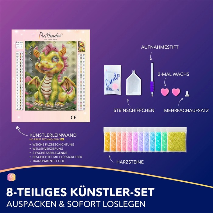 Im Set enthalten ist alles, was du brauchst: eine detailreiche Leinwand, farblich sortierte Harzsteine, ein Aufnahmestift, Wachs, ein Steinschiffchen sowie ein Mehrfachaufsatz für schnelleres Arbeiten. Damit kannst du direkt loslegen und dein eigenes Kunstwerk erschaffen.