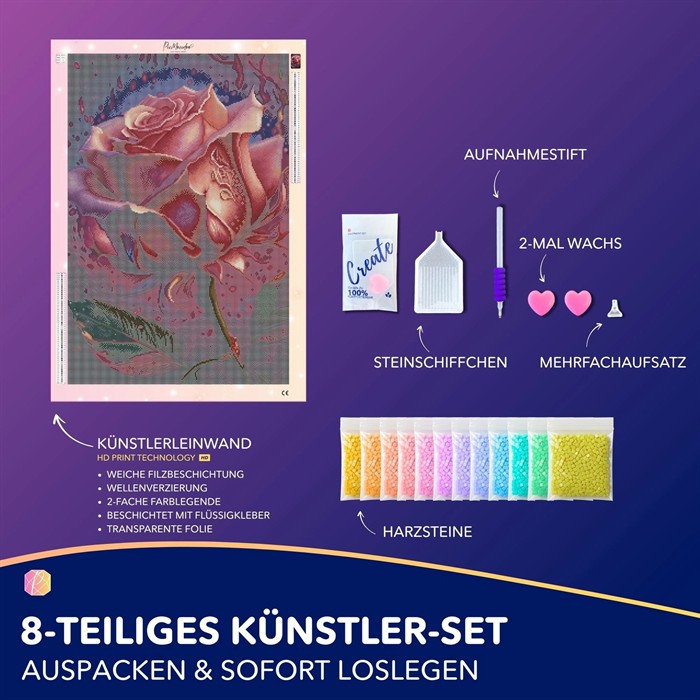 Im Set enthalten ist alles, was du brauchst: eine detailreiche Leinwand, farblich sortierte Harzsteine, ein Aufnahmestift, Wachs, ein Steinschiffchen sowie ein Mehrfachaufsatz für schnelleres Arbeiten. Damit kannst du direkt loslegen und dein eigenes Kunstwerk erschaffen.