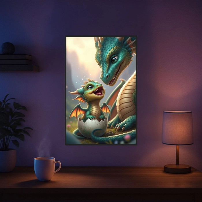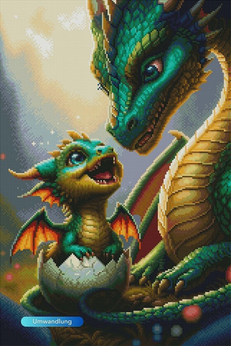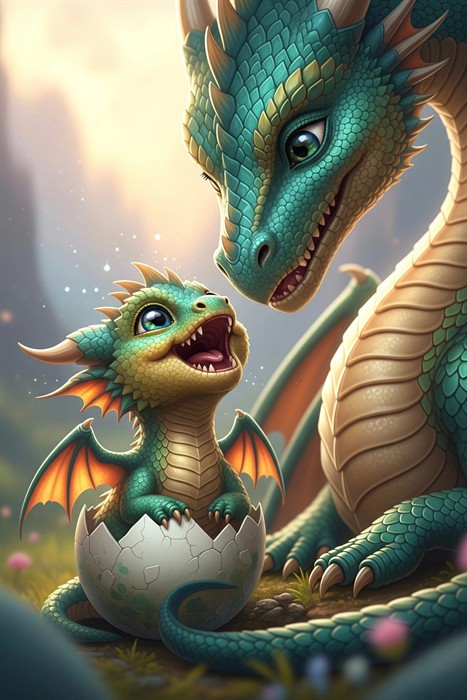 Ein berührendes Motiv voller Wärme und Magie: Der kleine Drache schlüpft gerade aus seinem Ei und blickt neugierig zu seinem grossen Beschützer auf. Die liebevolle Szene, kombiniert mit sanften Lichtverhältnissen und detailreichen Schuppenstrukturen, macht dieses Bild zu einem ganz besonderen Kunstwerk für alle Fantasy-Fans.