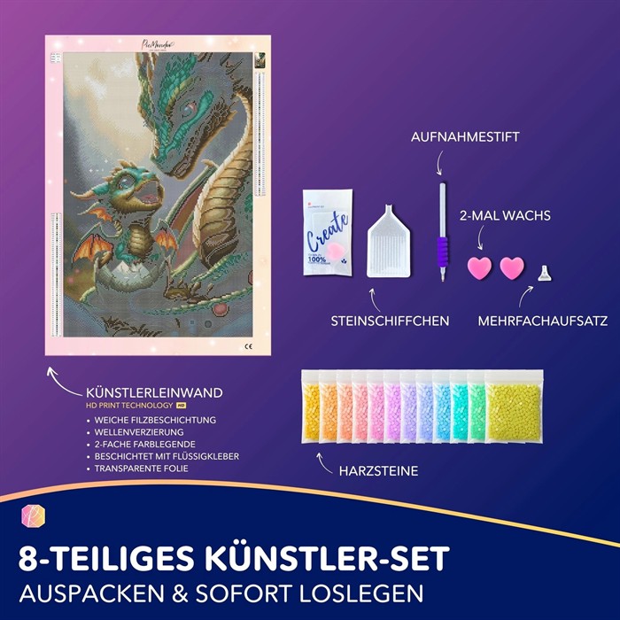 Im Set enthalten ist alles, was du brauchst: eine detailreiche Leinwand, farblich sortierte Harzsteine, ein Aufnahmestift, Wachs, ein Steinschiffchen sowie ein Mehrfachaufsatz für schnelleres Arbeiten. Damit kannst du direkt loslegen und dein eigenes Kunstwerk erschaffen.