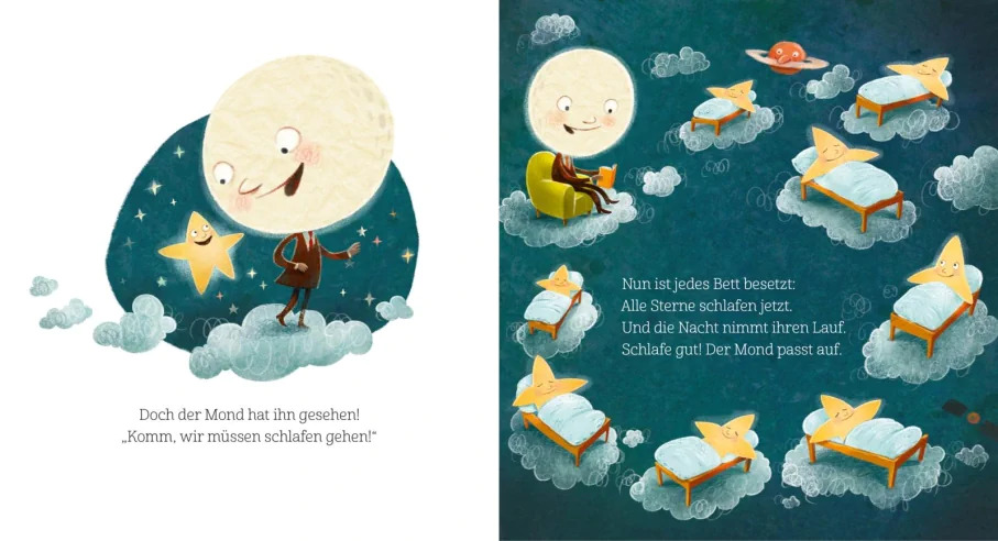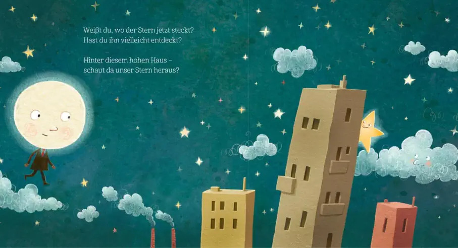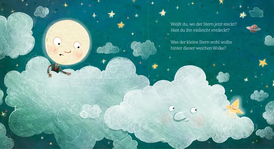 Jeden Abend zählt der Mond die Sterne aber heute fehlt ein kleiner Stern! Schau doch mal nach: Versteckt er sich etwa zwischen den Planeten? Hinter dem grossen Haus? Oder etwa in der weichen Wolke? Eine traumhaft schöne Einschlafgeschichte für alle Kleinen, die noch gar nicht müde sind…