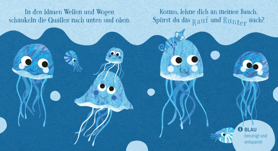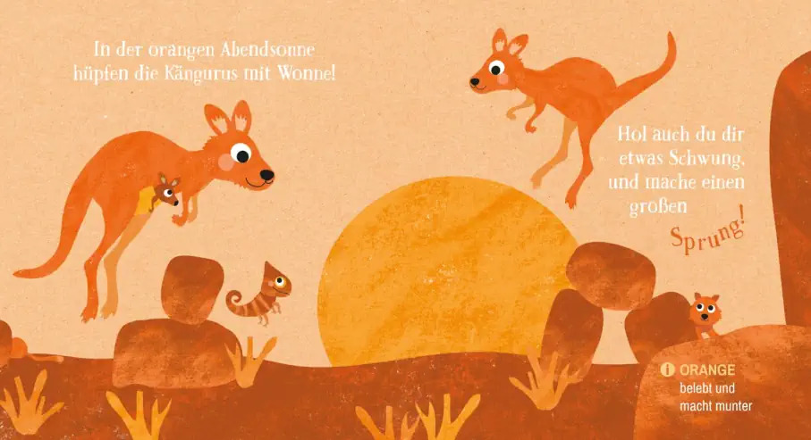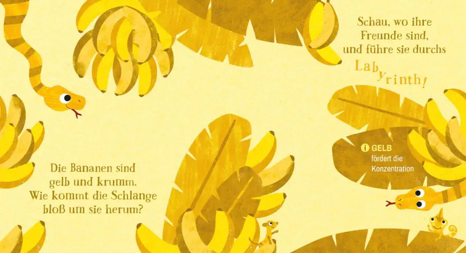 Das Konzept: Auf jeder Doppelseite steht eine bestimmte Farbwelt im Fokus. So können die Augen deines Kindes auf den einzelnen Farben ruhen.