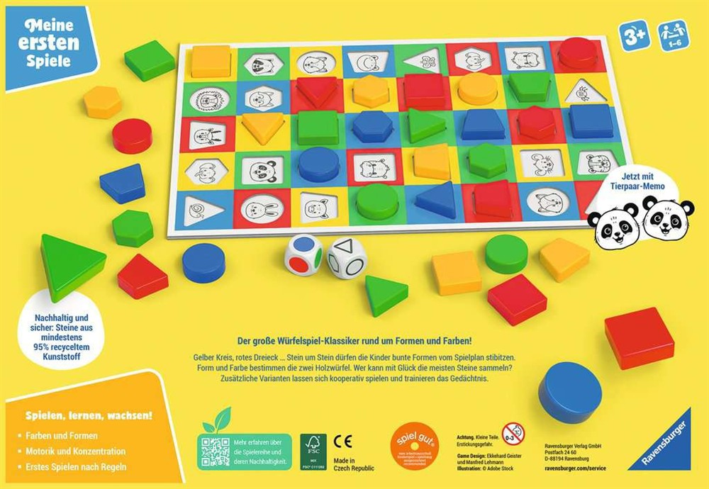 Bei "Colorama" können Kinder mit viel Spaß die Farben und Formen lernen. Rote Kreise, gelbe Vierecke, blaue Dreiecke ein kunterbuntes Durcheinander. Die Würfel zeigen ein Viereck und die Farbe Blau: Jetzt muss ein blaues Viereck gefunden werden. Wo ist ein passendes Feld auf dem Spielplan? Hier kommt der Spielstein hinein. Wer zuerst alle Spielsteine auf dem Plan untergebracht hat, gewinnt das Spiel. Ein Muss für jedes Kinderzimmer.Die verschiedenen Spielvarianten werden unterschiedlichen Alters- und Entwicklungsstufen gerecht und ermöglichen eine individuelle Förderung. Dieses Zuordnungsspiel fördert das Kennenlernen von Farben und geometrischen Formen, die Wahrnehmung, das Selbstvertrauen und die Ausdrucksfähigkeit. Colorama eignet sich perfekt als Lernspielzeug und ist ideal als Geschenk für Kinder bis 6 Jahren.