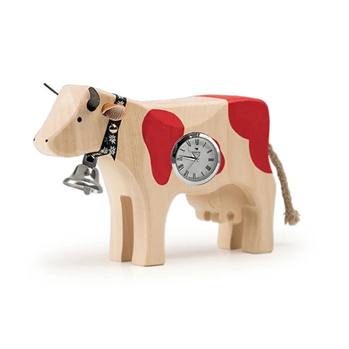 Diese charmante Holzkuh verbindet traditionelle Handwerkskunst mit einer integrierten Uhr und wird so zu einem besonderen Blickfang. Die Kombination aus naturbelassenem Holz, roten Akzenten und dem schlichten silbernen Zifferblatt verleiht ihr eine warme und lebendige Ausstrahlung.